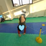 クモの巣反転ジャンプは、ゴムに付いている鈴を鳴らさないよう手を先に置いてから、足を持ってきます。