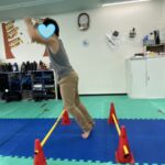 身体コントロール力:ゴム紐の高さに対して膝の曲げや蹴り上げの筋力調整ができる