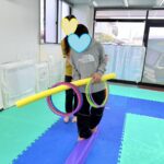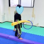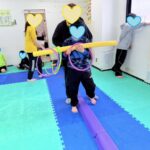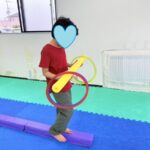 ゆらゆら平均台渡りは、スポンジ棒にフープを引っかけ、フープを落とさないようにバランスを取りながら平均台を歩きます!