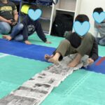 3チームに分かれ、長く伸ばした新聞紙をまずは足で引き寄せます!